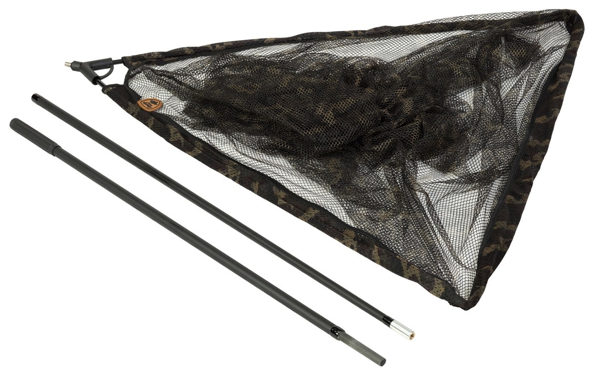 Kompletný kaprový podberák s dvojdielnou sklolaminátovou rukoväťou a hlavou o rozmere 105 x 105 cm, ktorá je osadená kamuflážovou sieťkou.